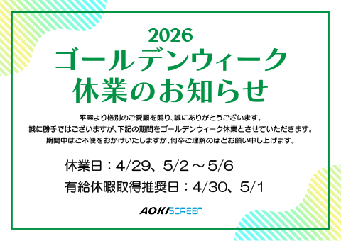 さて、このたび弊社は業務内容の明確化とブランド強化を目的として、2026年(令和8 年)4 月1 日をもちまして、株式会社青木工業所から「AOKIスクリーン株式会社」へ、社名を変更することとなりました。